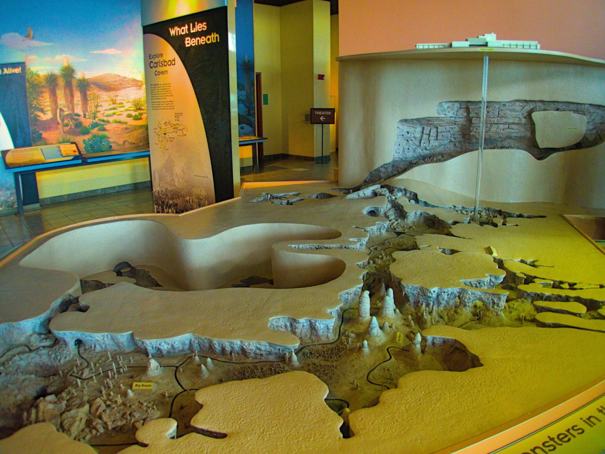 To put it all in perspective there is a model of the caverns in the visitor center. You can see the visitor center and elevator tube as well as the natural entrance on the top right of the photo below. The big room is at the bottom of the photo: