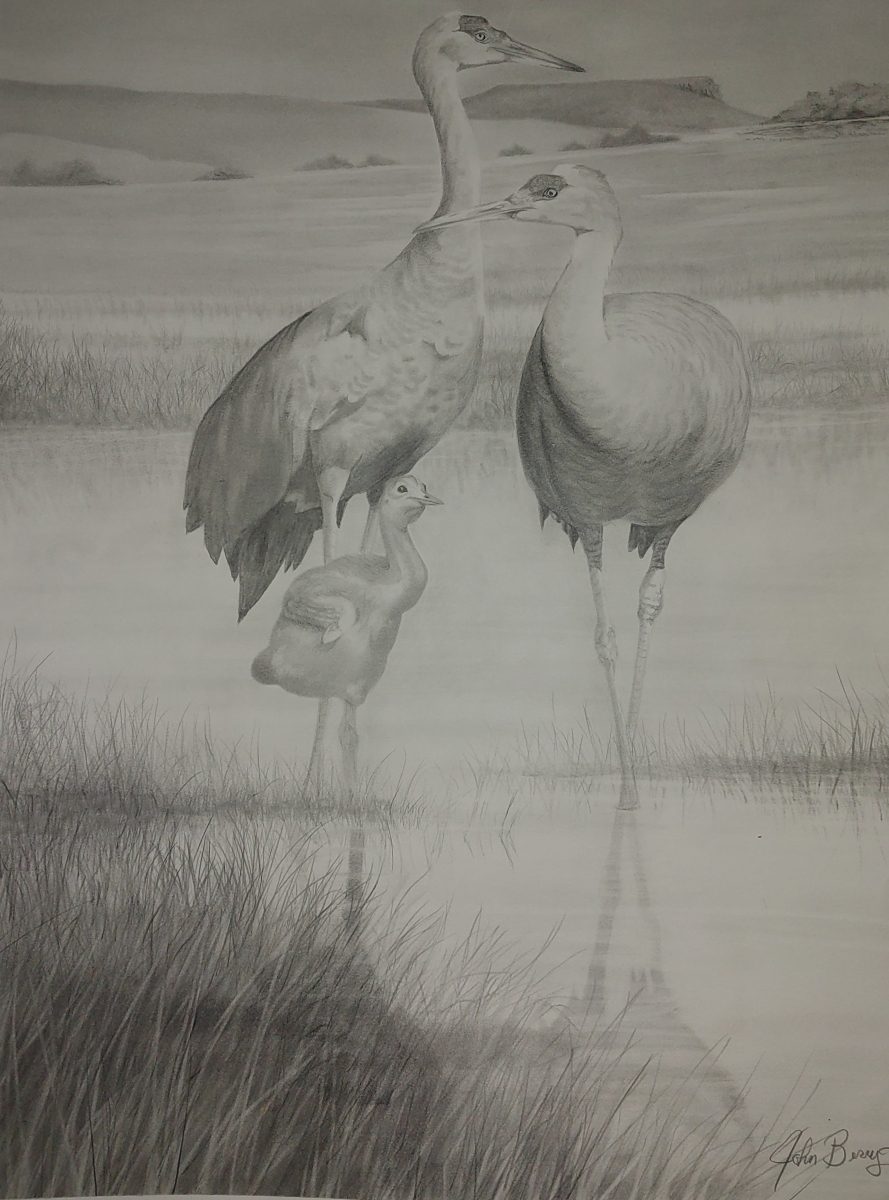 While not out watching the cranes we were back in camp soaking in the sun as the temperatures (reminder it is mid-December) reached into the upper 70’s. We met the most interesting character of the trip, John, who was staying for several days in another campsite. We got to hear John’s life story, quite and interesting one. He lives out of his converted short bus and stays long term at sites across Arizona and the rest of the west. He mentioned he was an artist as he told us his story. On our last day he invited us over to look at his portfolio of pencil drawings. I’ve never seen drawings quite as lifelike, full of detail, and quite simply amazing. He probably had 20 years of art in his bus, none of it for sale. In the end he ended up gifting us one of his drawings, our pick. He had one of three sandhill cranes. Of course we had to pick that one. We felt very lucky to have met John.